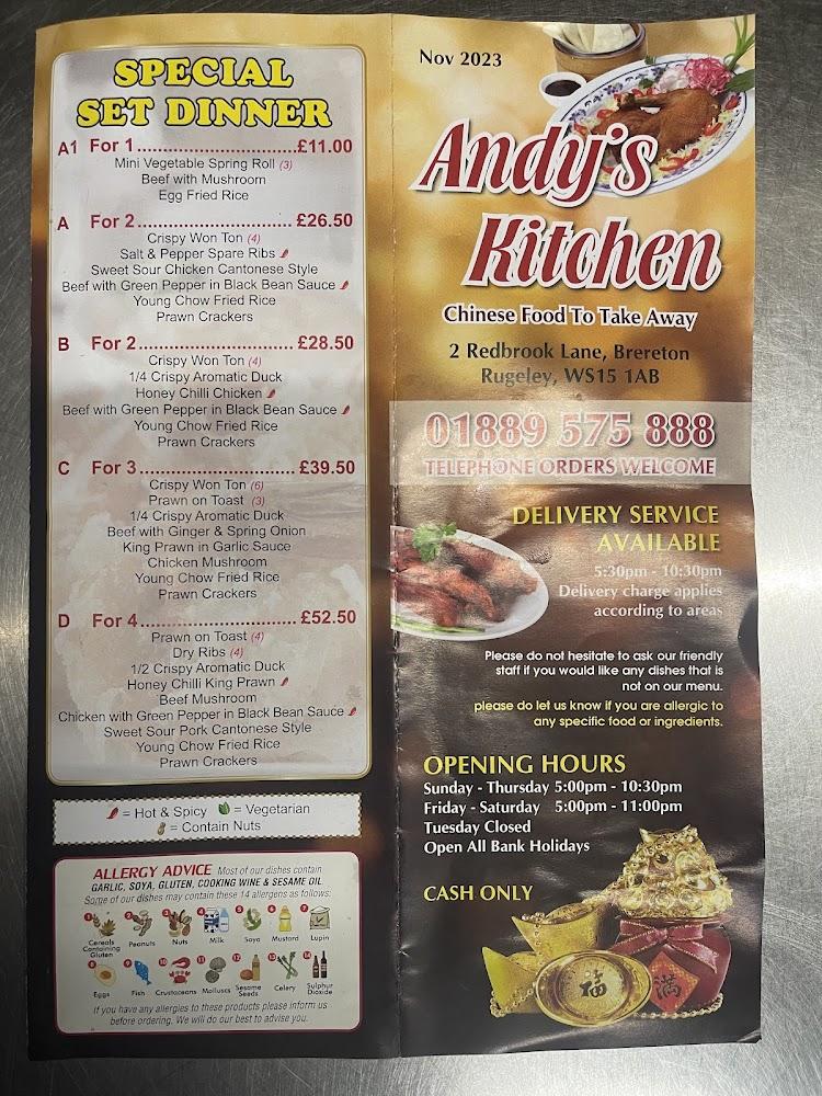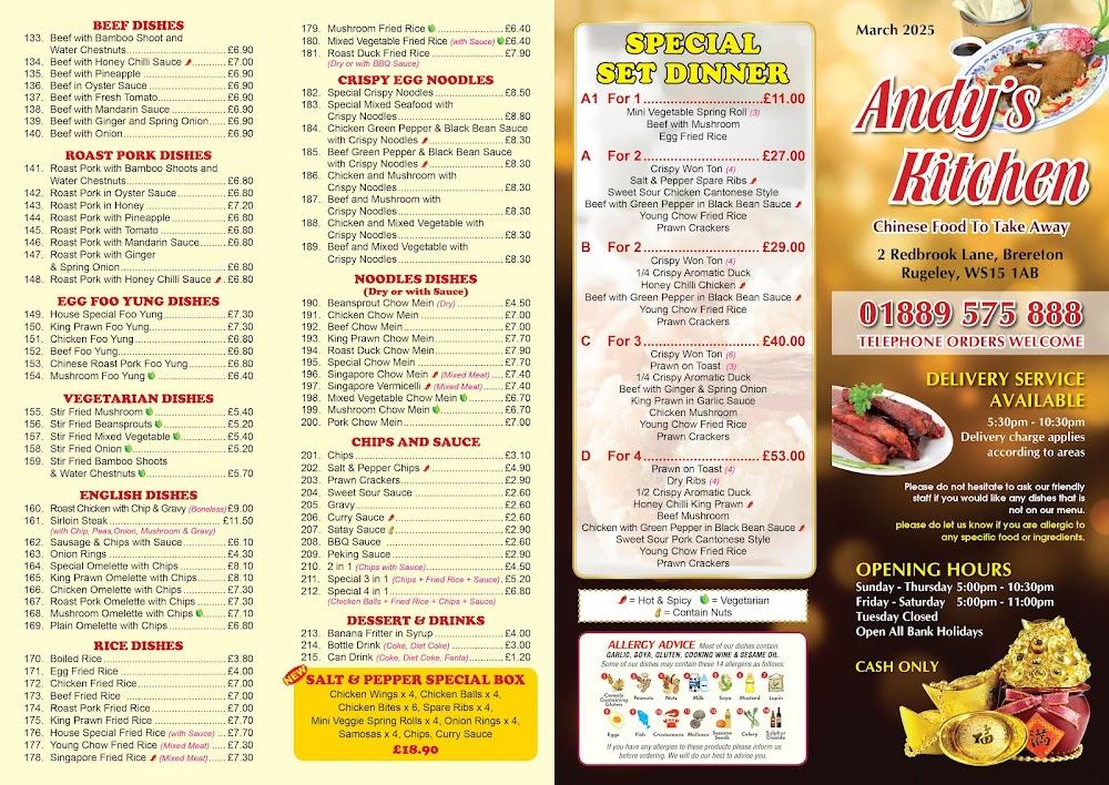 The area is accessible for those with mobility challenges, featuring wheelchair-friendly seating, ensuring everyone can enjoy a meal. With years of service to the community, Andy's Kitchen has embedded itself as a reliable spot in Rugeley's dining landscape. A quick look at the menu makes it clear why this takeaway stands out—whether you're a fan of classic sweet and sour chicken or crave the rich flavors of their Szechuan dishes, you’ll find something to satisfy your taste. Plus, the restaurant is open late, accommodating those late-night cravings or post-event relief in a bustling dining atmosphere.